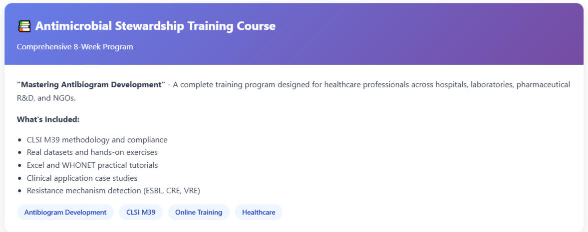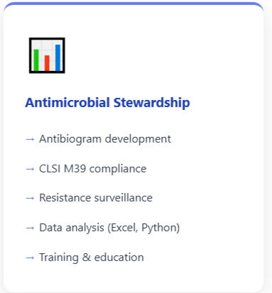 📊Antimicrobial Stewardship - Antibiogram development, resistance surveillance, CLSI M39My mission: Enhance pharmaceutical practices through innovation, research, and evidence-based antimicrobial stewardship.