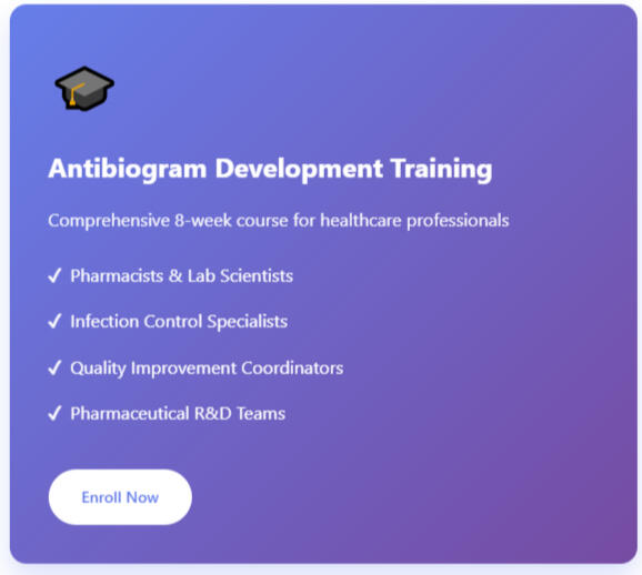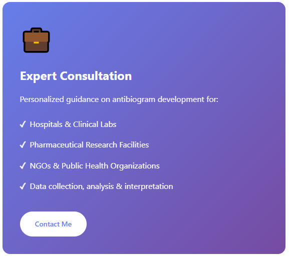 Whether you're looking to develop antibiograms for your institution, need guidance on antimicrobial stewardship, or want to discuss pharmaceutical research opportunities—I'm here to help.